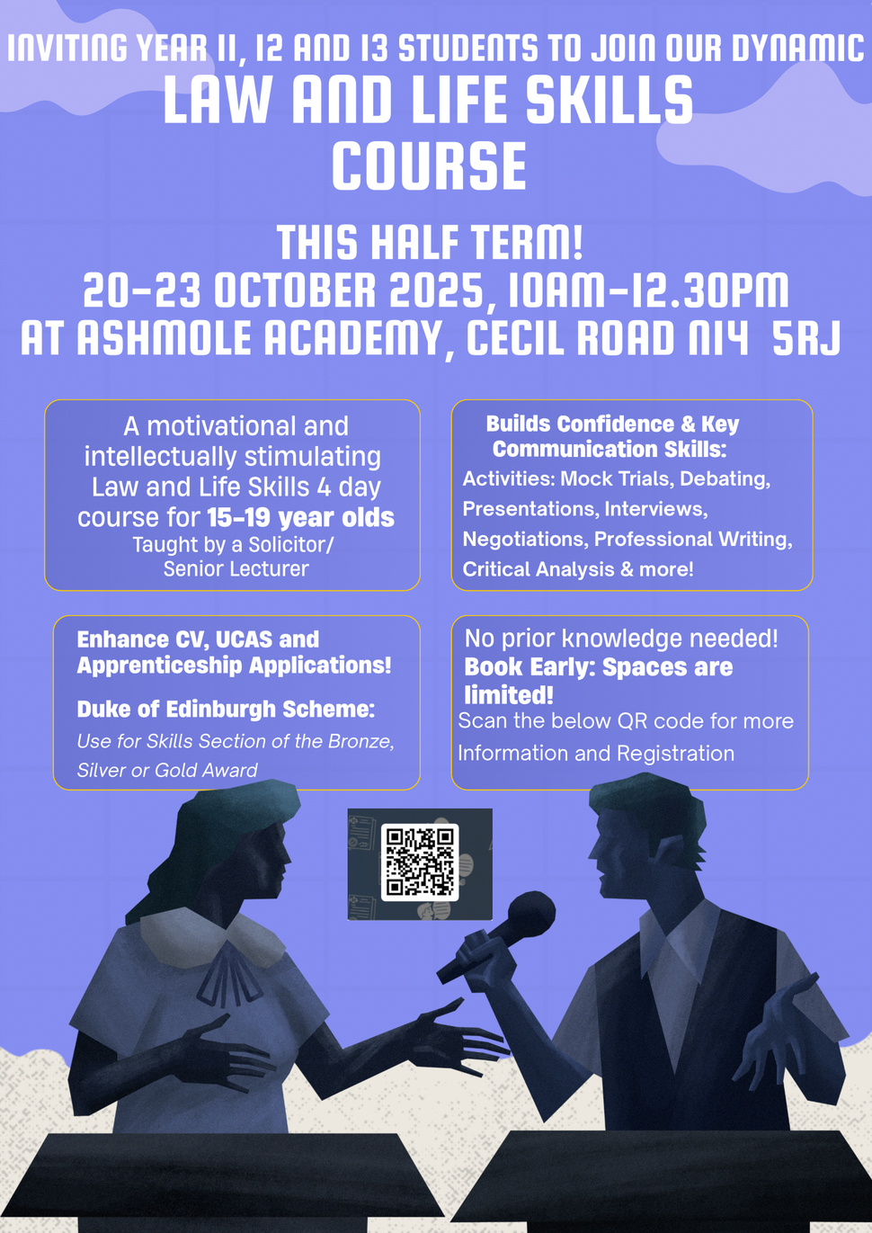 An exciting Law and Life Skills half term course open to all year 11, 12 and 13 students to develop confidence and communication skills through Law based activities such as debating, mock trial, interviews, professional writing, negotiations and more! Enhance UCAS and Apprenticeship applications, and use for the Duke of Edinburgh Skills section.