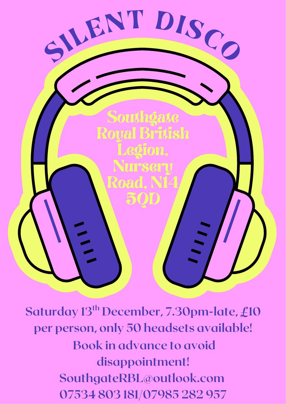 🎧 SILENT DISCO! 🎶 at Southgate Royal British Legion 📍 Nursery Road, N14 5QD 🗓️ Saturday 13th December | ⏰ 7:30pm – Late 💷 £10 per person Get ready for a night of music, dancing, and fun — all at your own volume! 💃🕺 We’ve only got 50 headsets available, so make sure to book in advance to avoid disappointment! 🎟️ To book your spot: 📧 [email protected] 📞 07534 803 181 / 07985 282 957