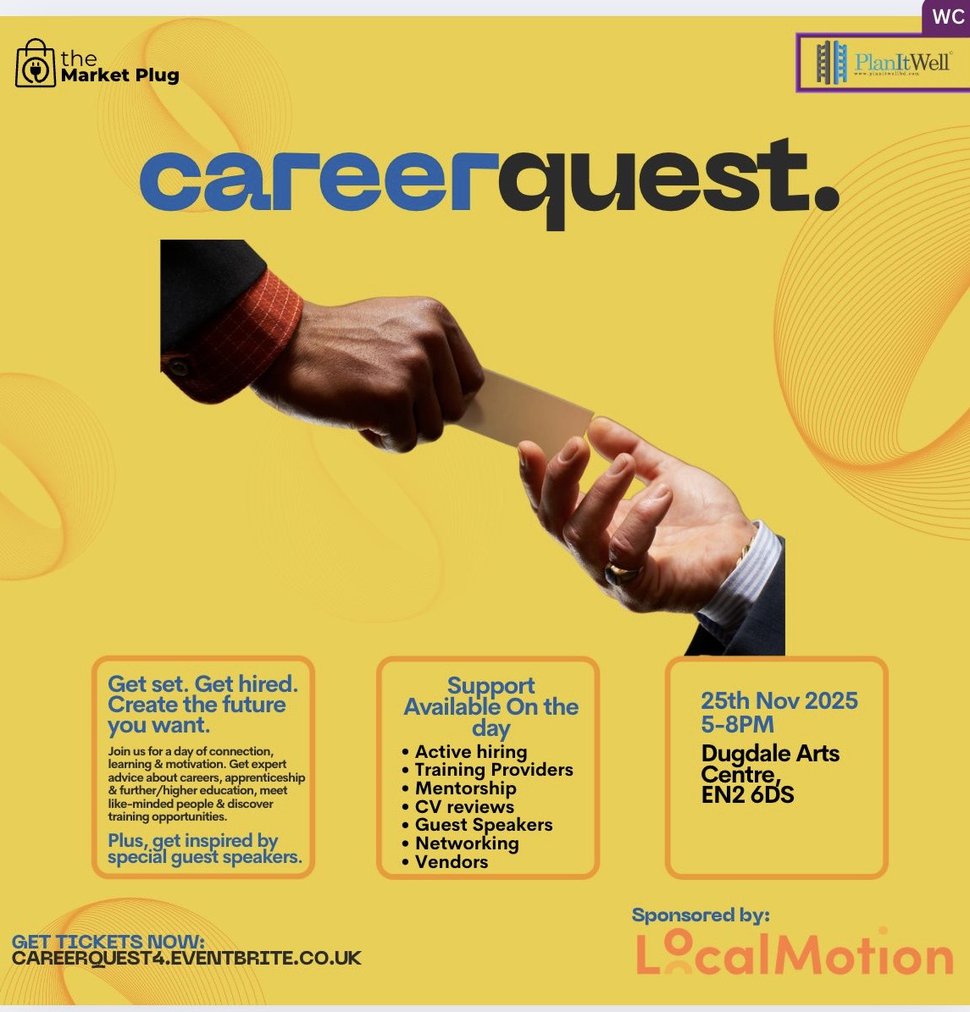 The next CareerQuest event is happening on Monday 25th November at Enfield’s Dugdale Arts Centre — and this month we’ll be interviewing the Mayor of Enfield Margeret Greer, in an inspiring live conversation! You’ll also have the chance to meet recruiters from Lidl’s management team, a leading security firm, tourism companies, and top training providers — all hiring on the day. Plus, you can get a free CV review and careers advice to help you take the next step in your career. Don’t miss this opportunity to network, learn, and level up your future!